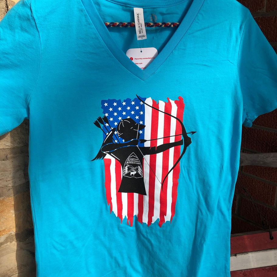 Light weight spun cotton Bella+Canvas women's Jersey V-neck T-shirts in turquoise. Full front image is Compton logoed female archer with USA flag as back drop.